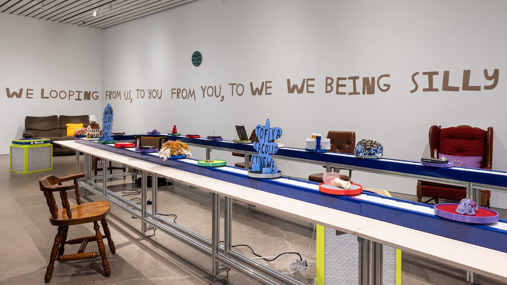 Embraced for its efficiency and mechanized transport of goods, the conveyor belt is reappropriated as a vehicle for cultivating a more relaxed museum-going experience. It welcomes informality, messiness, and unsettling the hierarchy of objects. Accompanying the exhibition are three solo exhibitions by artists agustine zegers, Sandie Yi, and Finnegan Shannon.